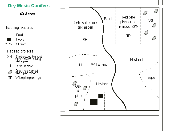 Management ConsiderationsIf you own a stand of white pine mixed with some hardwoods in a multiple-aged forest of seedlings, saplings, mature trees, and dead trees, then your forest is high-quality habitat and little further management may be needed at this time. However, in most cases you will probably need further management to successfully reestablish white pine in your forest. If your forest consists of a majority of red pine, jack pine, or oak with white pine growing in the understory, a timber harvest strategy could reestablish white pine as a dominant species and also produce income. Preferred management for a variety of white pine forest systems are timber harvesting methods that can include group selection, shelterwood, strip clearcut, or seed tree techniques. The openings that result from these cuts allow the regeneration of a diverse stand of pines, hardwoods, and herbaceous cover. These harvest methods leave mature trees in or adjacent to the cut to provide a seed source and/or shelter for the regenerating seedlings. For more information refer to the Timber Harvesting chapter in this section. Of these methods, the group selection method creates the least amount of disturbance to the existing forest.  It involves cutting small patches in the stand up to 1/2 acre in size.  Trees adjacent to these patches will provide both the seed source and shelter for the regerating trees. This cut should be no wider than 150 feet.  If possible, plan the