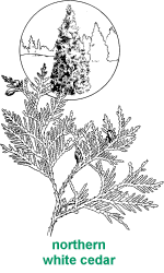 Spruce-tamarack bogs attract white-tailed deer, spruce grouse, snowshoe hare, bobcat, black bear, white-throated sparrow, ovenbird, red-eyed vireo, Nashville warbler, and common yellow-throat. Additional species that favor white cedar swamps include the Swainson's thrush, Tennessee warbler, and yellow-bellied flycatcher. DRY HARDWOODS are dominated by several species of oak and hickory and comprise six percent of Michigan