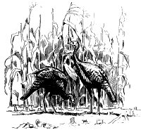 As spring changes into summer, hens typically lead their young to open areas with succulent ground vegetation including grasses, sedges, and a variety of forbs and legumes, especially clover. These fields of grass and legumes contain protein-rich insects, which make up 75 percent or more of the poults' diet until four or five months old. Insects include grasshoppers, ground beetles, flies, caterpillars, ants, and crickets. As the poults grow, the seeds of ragweeds, sunflowers, and grasses are favored along with the fruits of dogwood, wild grape, cherry, sumac, and blackberries. Wildlife managers generally agree that artificial feeding of wild turkeys can overly concentrate the birds in a small area, making them more susceptible to poaching and the spread of disease. Water is another important necessity. Turkeys need water almost daily, and hens rarely nest farther than a quarter-mile from a reliable water source such as a creek, spring, seep, or farm pond. CoverPrime cover includes a mixture of open areas within a mature (or nearly mature) forest containing a variety of tree species including white and red oaks, hickories, ash, beech, and white and jack pine. Turkeys use these mature trees as roosting sites but seldom roost in the same place on successive nights. Therefore, several suitable roosting locations scattered throughout their range are needed. Understory trees, and trees/shrubs at woodland edges or in openings also provide cover. Such trees and shrubs include ironwood, musclewood, hazelnut, beech, wild plum, serviceberry, mountain ash, wild black cherry, dogwood, crabapple, black locust, hawthorn, and pin and chokecherries.