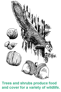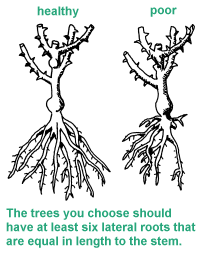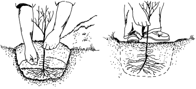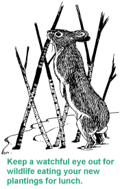 The Trees and Shrubs chapter in the Backyard Management section explains the wildlife value of key plant species, and considers landscaping goals and site selection. The Knowing Your Soil chapter in the Habitat Planning section will help you understand how to identify soil types and to know what plants will grow best on your property. This chapter focuses on how to purchase healthy trees and shrubs, plant them properly, and manage them successfully. Considerations include site selection and preparation, plant selection and pre-planting care, planting techniques, and post-planting care. Site Selection and PreparationThe decision to plant shrubs and trees should be made months in advance of their arrival at the nursery or at your local county Conservation District. For best success, plan in the spring or summer before planting (including soil testing), prepare the site for planting in fall, order stock in winter, and plant upon arrival in early spring. Place your order early or you may have to choose from leftover stock or receive your seedlings past prime planting time. Lack of planning is one of the main reasons why some landowners fail to grow healthy trees and shrubs. Select plant species that are adapted to the soil texture, drainage, and amount of shade at your site. Do not plant a shade intolerant tree in the shade of other trees as they will die. Slopes greater than 6 percent, odd-shaped fields, ditch banks, property boundaries and wetland and forest edges all make ideal shrub-planting sites. The local Conservation District office, nursery, public library or Michigan State University Extension offices will have information on specific plant requirements. Site preparation includes reducing weedy competition and any logging debris, and improves soil conditions for tree growth. Most planting failures can be traced to poor weed control, so this step is very important. Because weeds compete directly with seedlings for water, nutrients, and sunlight, they must be controlled before (and after) planting. In the fall before planting, place a weed-barrier cloth or apply a general emergent herbicide like Roundup. Be sure to read and follow all label directions. Individual planting sites should be 36 inches across. When planting in rows, prepare a 36 inch wide strip. All vegetation within the area must be killed. If weeds are growing again in spring when it is time to plant, apply an emergent herbicide once again. "Emergent" herbicides kill only those plants already growing. Mechanical treatments such as disking or plowing will also help to control weeds. Many tree planters even scrape the sod off the planting site at the time of planting to reduce weed competition. Plant Selection and Pre-Planting CareYou may purchase trees and shrubs as transplants or seedlings. Transplants are plants that were uprooted and planted in another location, while seedlings are young plants grown in one location. Both are available in bare-root form or come with soil either in containers or balled and burlapped. Seedlings are less expensive when bought in large amounts. They are also easier to plant with a tree planter because of their small roots. Transplanted stock is more expensive than seedlings, but survival and growth rates after planting are often better. In addition, larger transplant stock grows more quickly into recognizable trees or shrubs. When only a small number of trees and shrubs are needed, purchasing them with soil attached is a good idea because planting success rates are higher due to decreased shock to the plant. If possible, it is best to choose plants that were grown from a local source. Seedlings can be one, two, or three years old and are designated as 1-0, 2-0, or 3-0 stock. Transplants are usually three to five years of age, and the last number in the sequence tells how long they have been in the transplant beds. For example, stock designated as 2-1 is three years old total, the last year of which was spent as a transplant. In addition to age, some seedlings and transplants are sold by height class, which has the advantage of establishing a plantation that should develop uniformly. Seedling sizes may range from six to 12 inches. Buy the biggest or oldest seedlings you can afford. Avoid small, spindly stock less than six inches tall. Hardwood saplings should have a trunk diameter (also called a stem caliper) of at least 3/8 inch and at least six vigorous lateral roots that should be equal in length to the stem. Avoid hardwood stock with a single large taproot.