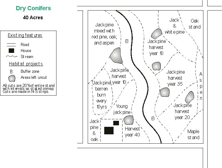 Management ConsiderationsSome type of disturbance, such as fire or timber harvest, is needed to maintain a jack pine forest. However, fire as a management technique has its perils. As a result, timber harvesting, often followed by artificial seeding or planting, is more commonly used in forest management. Professionals recommend either or both management techniques, especially for those property owners with 200 or more acres of dry conifer forest. The following are options to consider when managing dry conifers. Prescribed BurningIf used safely, fire is the most effective management tool, particularly if a composite of forest, barrens, and grassy openings is your objective. Also, fire is the common means by which jack pine forests are rejuvinated. Jack pine is unusually adapted to fire because their pine cones are coated with a resin that melts at 112 degrees F., a temperature normally reached only through fire. Once the resin melts, the cones open and thousands of seeds are released. Fire also decreases competition, reduces leaf litter on the forest floor, prepares a good seed bed for regeneration, and releases nutrients into the soil. Besides the positive influence on jack pines, fire maintains the variety of prairie grasses and flowers that are also dependent on fire for their survival. Consider conducting a controlled burn on any complex of forest, grasslands, and barrens that is at least 20 acres in size. Such areas should be burned at 10 to 20 year intervals. You may also want to consider burning after your forest is clearcut and then follow with seeding or planting with trees. Because of economies of scale, bigger burns are more appropriate and cheaper. Fire, as a tool, can be complex and dangerous. Rightly so, it is best left in the hands of a trained resource professional. Also, whenever prescribed fire is used as a management tool, you must work with your local fire officials to obtain permits and regulations. In many instances, the use of prescribed burning of jack pine forest is very limited on private lands, especially on smaller tracts. For more information, see the chapter on Prescribed Burning in the Grassland Management section. Timber HarvestingTimer harvesting produces many but not all of the same positive effects as fire. The Timber Harvesting chapter, located in the Forest Management section, explains several options to consider. Clearcutting is the preferred way for managing jack pine stands from 20 to 200 acres in size. In this scenario, young pine is promoted soon after the mature trees are cut.