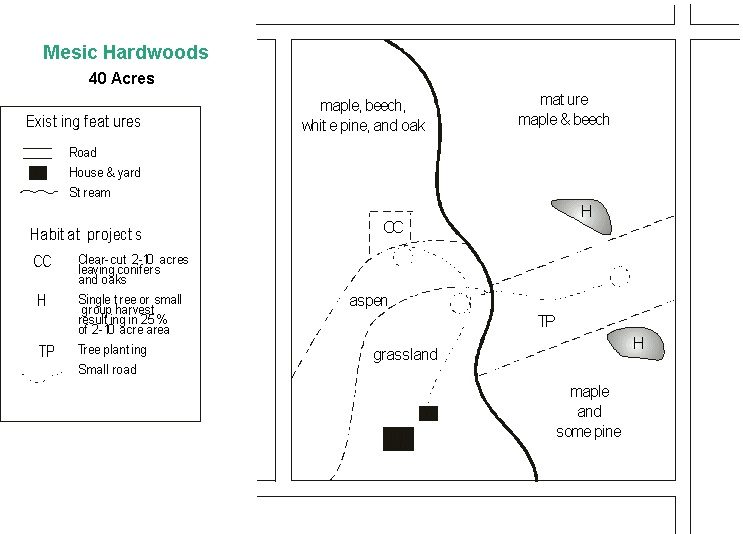 Seasonal wetlands in these forests attract many migrating and nesting birds due to large amounts of insects present at these times. The wetlands within these forests also provide critical habitat for several kinds of frogs--the chorus, wood, and gray tree species. Management ConsiderationsManagement options for mesic hardwood forests include both protection and timber harvesting. If you own a mature mesic hardwood stand that is diverse in structure and species composition, it may be best to disturb the stand as little as possible. Structural diversity refers to age, tree diameter, crown size, and shape of trees within the stand. Included are microhabitats, such as cavities and crotches, within individual trees. Compositional diversity promotes a mixture of several tree species. In a forest like this, little timber harvest is needed to increase the value to wildlife. However, like all other forest types, mesic forests change with time, and some type of management may be needed to keep them viable for some species of wildlife. Also, the market value of the forest is sometimes an important consideration to landowners. When conducting timber harvesting, you must take into account the full range of benefits that these forests provide. Such benefits include habitat for wildlife, soil protected from erosion, good water quality in streams and ponds, and a healthy environment for soil organisms. Any cutting program you choose should also take into account local factors--problems with gypsy moth infestation or overbrowsing by deer--and the importance or unique nature of the forest relative to surrounding landscapes. ProtectionIf your forest has a diversity of trees along with a variety of understory shrubs and plants, it is probably in good shape to be managed as a mature stand. Many migratory songbirds that nest in these forests are declining due to stand-size reduction, which occurs when property is developed or subdivided. Species that need a large amount of interior forest are jeopardized when large, intact, mature stands of 100 acres or larger are fragmented. Such interior species include the American redstart, ovenbird, wood thrush, and red-eyed vireo. Because there are not many large tracts of mature forest, these forests should not be fragmented if possible. Therefore, do not disturb intact stands by adding roads and clearings, erecting buildings, or allowing livestock to graze. Also, stands that connect waterways or other woodlands offer the greatest benefit to wildlife and should be maintained or restored whenever possible. Please see the chapter on Edges and Fragments in the Habitat Planning section for more information. Timber HarvestingThere are two timber harvesting methods: uneven-aged management and even-aged management. Both methods are discussed in detail in the Timber Harvesting chapter in this section. Uneven-aged management promotes a forest of mixed-aged trees of many species and is the best timber harvesting method for wildlife in these forests. It creates the least amount of disturbance and helps to maintain the