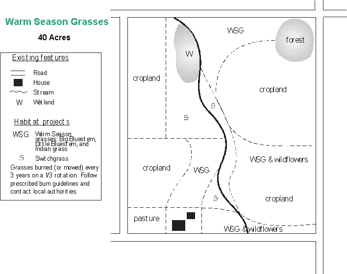 Stand PlantingWarm season grasses take about three to five years to reach maximum height, and so landowners should not judge their efforts too early. Seedbed preparation is critically important. Because the seeds of warm season grasses are tiny and fluffy (except for switchgrass), they are difficult to run through typical planters and broadcasters. Planting alternatives include no-till grain drills specifically designed to plant the fluffy native grass seed, hand seeding, or purchasing more expensive debearded grass seed (seed that has had the fluffy material removed) which then can be planted more easily with a conventional planter. Plant at the total rate of 4 to 6 lbs./acre of pure live seed (PLS) for a mixture of two or three grasses. PLS takes into account that a quantity of seed will contain seed hulls, inert materials, and seed that will not germinate. A 10 lb. bag of seed may contain only 7 lbs. of PLS. Add wildflowers at the rate of 0.5 lbs. to 1 lb. per acre. Stand ManagementThe quality of a warm season grass stand usually peaks at five to seven years after establishment. Subsequently, they become dominated with matted grasses and dead vegetation, which reduce their vigor and offer less variety. In time, woody plants (trees and shrubs) become established. The grassland then becomes a brushland and becomes habitat for other wildlife species such as deer, rabbits, and songbirds who prefer brushy habitats. Watch your native grass stands for signs of deterioration, such as poor reproduction. To keep the stand productive for years, management tools such as burning, mowing, and grazing may be needed. The careful use of selective herbicides is another consideration. These tools stimulate regrowth and reduce the competition from woody plants, increase stand vigor, and promote quality grassland habitat. A prescribed burn is a planned fire, burning with a specific purpose. It is best done on a day with light wind, relatively low humidity, in early spring when vegetation is dry. Discuss your plans with local authorities, obtain the necessary burning permit, and observe all restrictions and safety procedures. Trained individuals using appropriate equipment should conduct burns. For more information see the Prescribed Burning chapter. Mowing or grazing in a three to five year rotation will slow encroachment of woody plants. Depending on your goals, and the size of your grassland, you may wish to divide the field into three to five segments of equal size and treat one segment each year. Mow in strips 30 to 60 feet wide and leave unmowed areas of 60 to 100 feet wide between them, or mow blocks of grass on a three to five year rotation. Mowing, haying, or grazing the grass stands should occur between July 15 and August 31. This will give nesting birds an opportunity to hatch their eggs. Do not mow or graze warm season grasses below eight inches in height, damage to the plant could occur if cut below this level. When haying or grazing, fertilizers should be added every three to five years to return nutrients back to the soil. Chemical treatment will also control woody plants, but correct application is critical. If you ignore label instructions, you may destroy non-target vegetation, which could have a negative impact on wildlife. In summary, warm season grasslands were originally found throughout much of Michigan. They are an extremely important component of many wildlife species habitat needs. Efforts must continue to protect and enhance the grasslands that remain in Michigan and landowners can play a major role towards that objective.