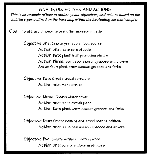 grassland birds, that your land only provides winter cover, and not nesting habitat or a reliable food source. Because having grassland birds was an important goal in this instance, an objective to achieve this goal would be to consider the creation of year-round habitat. In other words, in finding what your objectives are, you must determine what is needed to fulfill your goal.