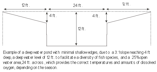 emergent vegetation, most species of which grow in water less than four feet deep. For this reason, create steep slopes to a depth of four feet or more. Slopes should range from a minimum ratio of 2:1 (2 feet of horizontal per 1 foot drop) to a maximum of 3:1 (3 feet of horizontal per 1 foot drop). Minimize the amount of edge by constructing a circular or