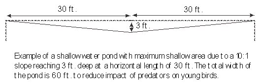 For shallow ponds, increasing the amount of edge makes the pond more productive for wildlife. Irregular-shaped projects or long, rectangular ones with scalloped edges will have more edge, increasing its wildlife value. Slope design should be flatter, ranging from 3:1 to 10:1 (horizontal:drop), and projects that are at least 60 feet wide reduce the impact of