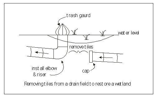 Before BeginningWetland restoration is typically NOT a do-it-yourself project. A wildlife biologist or wetland specialist can help assess the project area, look for potential impacts to others, and determine if hydric soils and a water source are present. Voluntary programs offering technical and financial help may be available to help restore your wetland - check with your local CD staff for initial assistance before proceeding any further. You can probably save yourself time and money by working with the CD staff. Projects begin with planning to determine feasibility and design. Without proper planning, projects may lead to problems for you or your neighbors. Develop a reasonable management goal and stick to it. Safety is a primary concern both during and after construction. Also, the good neighbor policy applies -you don't want to flood a neighbor's crop field or basement, or interrupt their drainage. By talking with your neighbors you can address their concerns, and may find they want to join in on the project. In addition, watershed size is important - too much water or too little water may mean the project is not workable. If a project looks like a "go," survey equipment will be used to determine water levels for the completed project and to help design structures, such as ditch plugs, dikes, or spillways. Finally, local, state, or federal permits may be needed. In Michigan, permits are required from the Michigan Department of Environmental Quality (DEQ) for any work in a stream, floodplain, and most existing wetland areas. Restoration TechniquesTypical projects restore water to a fully or partially drained wetland basin by removing underground drain tiles, plugging open ditches, or building small dikes. Projects are often one to three acres in size, and have an average water depth of about 18 inches. Many small-basin wetlands of this type that were drained for agriculture, provide opportunities for restoration today. Generally marshes or swamps, with seasonal or permanent water, are most often restored. An Example of Tile RemovalThe simplest restoration, a "tile break," involves removing a section of underground agricultural tile that is draining a wetland basin. Drain tile, or field tile as it is often called, is usually made of clay or perforated plastic and buried at a depth of two to six feet. Generally, a contractor with a backhoe is used to remove or crush a 25 to 50 ft section of tile downstream of the basin. The downstream end or outlet pipe is then plugged with a bag of redi-mix concrete or clean clay fill, and the trench is filled. Sometimes, a portion of unperforated tile, called a riser, is connected to the downstream end of the tile line and brought to the surface in order to control the water level. Water will fill the wetland basin until it reaches the mouth of this riser where it will then flow back through the tile line into the ditch. This may work well when you wish to maintain downstream drainage. A "ditch plug" restoration builds an earthen wall to impound water. This type of restoration uses equipment to fill a portion of a drainage ditch to natural ground level. Again, a riser may be used to let water flow through a tube once it reaches a certain level. A small dike or berm may also be used, which will impound the water that will begin to collect once the drain has been plugged. A dike prevents the drainage of water downstream and requires a spill way or other water-control structure to regulate the water level and prevent the dike from being washed away during periods of heavy runoff. Examples of Restorations Using Ditch Plugs and Tile BreaksTypically, a berm or dike is constructed with a top width of eight to 10 feet and a maximum side slope of 3:1 (three feet of horizontal width to each foot of rise). A three foot high dike would have a bottom width of 24 to 30 feet. When constructing a low-level dike, soil is often pushed up or excavated from within the former wetland site. This helps to form a deeper pool within the basin. Sod and topsoil are stripped from the construction site and stockpiled. The dike or berm is then constructed with subsoil, often with a good clay component. Topsoil from the basin, which is a good seed source for wetland plants, is then spread back into the basin and on the dike or berm. Disturbed upland areas, including areas of the ditch plug, dike, or berm, are seeded with grasses to minimize erosion and provide cover. Generally, nothing is planted in the wetland basin as wetland vegetation usually re-establishes itself quickly from seeds that have remained dormant in the soil. Managing water, especially excess water, is important on restoration projects. A water-control structure can be used to manage water levels within a project. Examples include plastic or metal risers, and corrugated metal or plastic stop-log structures. These help to manage the normal flow of water. An emergency spillway, which is a wide trough-like opening in the side of the dike, should be designed into wetland restoration projects if excess water is expected during flood events. Emergency spillways are sized according to the watershed but typically are at least eight feet wide and one to two feet below the top of the ditch plug, dike, or berm. These spillways allow water to pass through without damaging the retention structures in high-water events. Since water management is critical, consult a professional for design specifications suitable for your wetland. Most restoration projects involve open-area wetlands, but forest and shrub wetlands are also important and can be restored too. Restoration of wooded sites should be done cautiously, however, to avoid killing the trees and shrubs that normally grow in wetlands. Woody wetland plants can often withstand brief flooding during the growing season, but be aware that prolonged inundation may stress trees and kill them. Maintenance of the Restored SiteSimple basin restorations should be relatively maintenance