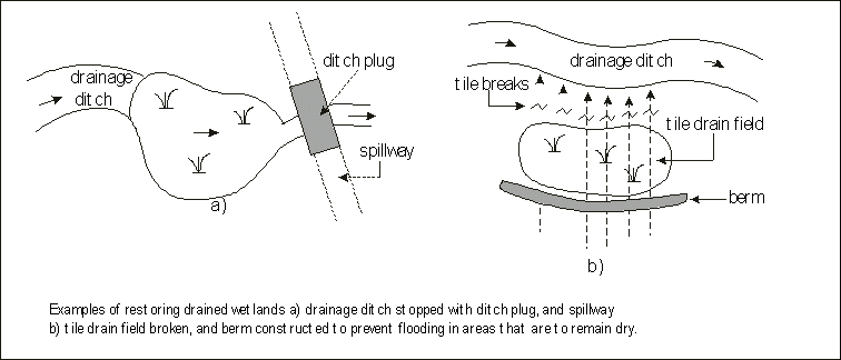Wetland restoration involves returning one or more of these three characteristics to a site. Hydric soils form over a long period of time and the soil characteristics are very difficult to create. For this reason, restorations take place where the hydric soils remain but the hydrology or vegetation has been altered. Wetland Creation Versus RestorationWetland creation involves impounding water with berms and dikes or by excavating depressions in areas that did not previously contain wetland soils or vegetation. Essentially, all three key characteristics are missing. Adding these characteristics where they do not exist is difficult, costly, and often unsuccessful. Financial assistance to land owners is not generally available. For these reasons, landowners are often discouraged from undertaking creation projects. However, it is possible to create a small shallow pond for wildlife on upland areas. Refer to the chapter on Building and Managing Ponds in this section for more information. Wetland restoration involves returning one of the wetland ingredients, generally water retension, to a degraded or drained wetland site. Sites that have been ditched, tiled or leveed, or degraded from excessive logging, uncontrolled cattle grazing, or unrestricted off-road vehicle use are all candidates for restoration. Projects can span the spectrum from curtailing these or other damaging practices to restoring the water source and/or other wetland properties. Because the degree of current damage will vary, the effort needed to restore sites will also vary. For instance, a partially drained wetland may be fairly simple to restore to its natural water level. The remainder of this chapter will focus on restoring wetlands that have been fully or partially drained.