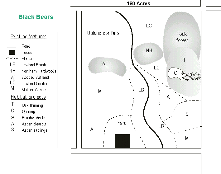 Within your forest it is important to maintain both closed and open canopies. Closed canopies (close-growing trees whose thick crowns block sunlight) provide important security and escape cover for bears. Open canopies (trees which allow sunlight on the forest ground) support a dense understory that produces berries and other fruit. The understory will be dense with fruiting shrubs and there will be plenty of hard and soft mast food reserves. This combination of adequate food and inaccessible terrain typically includes a large geographic area. When food is not available, bears will wander great distances to find it. The following are options to consider when managing habitat for black bears: