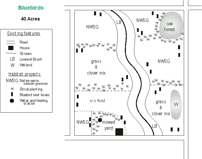 Although bluebirds do not winter in Michigan in large numbers, they may be found in wetlands where they feed on sumac, wild grapes, pokeweed, honeysuckle, poison ivy, and holly. Bluebirds do not migrate long distances, and when food abounds in mild winters, they go no farther south than is necessary. Bird feeders containing a mixture of peanut butter and cornmeal may also attract them in winter. Like most birds, bluebirds are attracted to water. Bluebirds like to bathe nearly every day and sometimes several times daily. Therefore, the presence of an abundance of water is important in their survival. Management ConsiderationsSince bluebirds are territorial, your land will only support a limited number of bluebird pairs. They will usually not nest within 100 yards of each other. Keep this in mind when measuring the success of your management. Oak savannas, oak barrens, and jack-pine barrens are good examples of native habitat important to bluebirds. Generally, bluebirds do best where soils are either very dry or very wet. Trees have a difficult time becoming established in these areas, and the scattered trees that result often make good nesting sites for bluebirds. Habitat manipulation should be minimal in these types of areas, although fire management can be beneficial in oak savannas, oak barrens, and jack-pine barrens where it can be safely executed by fire management professionals (permits are usually required). In other areas, such as abandoned orchards and old fields, more active management may be needed. The following are options to consider when managing for bluebirds: