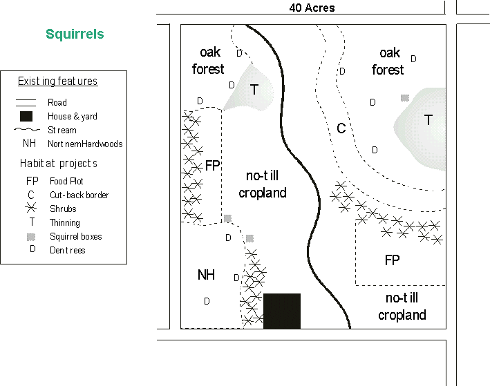 The young are born hairless with closed eyes and ears. Hair begins to grow on their back in about one week and the eyes open at 35 days. At about two months old, the young may begin exploring outside the den. At this time if the weather is warm, the female may build a leaf nest high in the tree canopy among forked branches. At three months of age, young squirrels can survive on their own, and at 18 weeks they begin building their own leaf nests. These circular leaf nests are compact and waterproof and may be built in both leaf-bearing and evergreen trees. Squirrels forage in tree tops and on the ground. A social hierarchy determines which squirrels get the preferred foods, best nest sites, and mates. Each animal in the local population will have a rank, ranging from the dominant male and female, to the newborn. When food supplies are abundant, squirrels may feed together. During severe winter weather, some even share winter dens which means they can share body warmth. Normally, though, they gather in groups only during mating season. Management ConsiderationsA consistent food supply and a selection of good den sites in mature trees will attract squirrels to your land. Although they are omnivorous and opportunistic, squirrels nevertheless have preferred foods. Important hard mast species include the nuts of white oak, red oak, black oak, beech, hickory, walnut, bur oak, pin oak, and butternut. Fox squirrels in particular like walnuts and hickory nuts. The gray squirrel's diet is more varied. Both species, however, also enjoy corn, sunflowers, and soybeans. Squirrels eat the seeds of maple, ash, and tuliptree. They like the soft mast of flowering dogwood, juneberries, thornapples, apples, seasonal mushrooms, the buds and catkins of various shrubs, green grasses, and the leaves of legumes in spring. Sometimes they will eat beetles, salamanders, bird eggs, and nestlings. When very hungry, they will consume the bark and sap of sugar maple.
