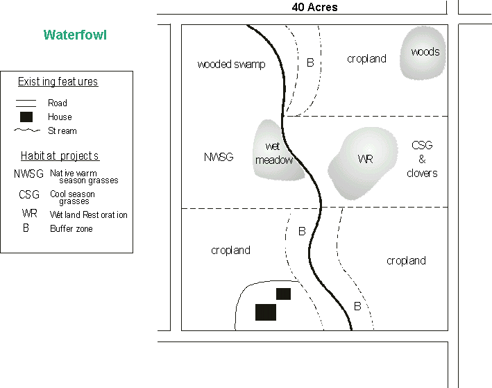 In summary, much can be done to manage your wetland for waterfowl. Providing a diversity of wetland types, with adequate adjacent cover is the best way to attract waterfowl. Wetlands differ according to location, topography, water level, water quality ,and the kinds and numbers of plants and animals that use them seasonally. Those wetland complexes that are most diverse, in terms of water levels, cover types, and surrounding uplands, are the most beneficial to waterfowl. They should be protected at all times and restored whenever possible.