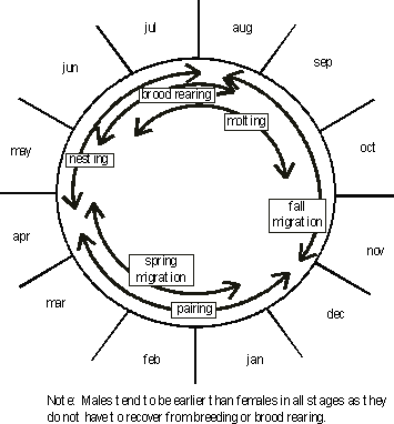 annual cycle Waterfowl foods do not only vary seasonally, but they also vary substantially among species. For example, wood duck females eat mostly acorns and other plant food in fall and winter, then rely more and more on invertebrates during the nesting season, with plant life furnishing about 20% percent of their needs during the egg-laying period. By contrast, gadwalls use half plant food and half animal food in both spring and summer. Canada geese are grazers and will feed mainly on vegetation. As you can see, a variety of wetlands and uplands are needed to meet the seasonal needs of waterfowl. A wetland complex with different types of habitat is most desirable because it will provide different food and cover at different times of the year. Wetlands that feature secure cover and food production for brood rearing are critical for the welfare of waterfowl. However, each species has different specific needs. Life Cycles of Three Common WaterfowlThe following brief explanations illustrate the special needs that different species of waterfowl require: