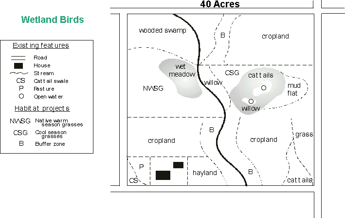 Many different wetland birds are attracted to a variety of wetlands based on the type of food and cover provided. For example, plovers and sandpipers are attracted to shorelines with little vegetation where they nest, and find insects and other food. Bitterns, yellow rails, and herons are wading species that depend upon shallow water with cattails, bulrush, and smartweed to provide food such as small fish, frogs, and invertebrates such as snails, crayfish, and insects. The type of food and cover present in a wetland is based on water levels and vegetation composition. Throughout the year, different types of wetlands contain varying depths of water, or no water at all, which determines the type of vegetation that will grow there. Wetlands with both dense and sparse stands of vegetation provide food and cover for specific types of birds. Some wetland cover types include dense cattail stands, grassy meadows, and wooded swamps. Sedge fields, wet meadows, mud flats, and beaches all provide good food sources, including insects and seeds, for a variety of wetland birds. The food and cover needs of many bird species also varies by seasonal activity. Migration stop-over, pair bonding, nesting, and brood rearing often require different components of a wetland. In general, if you want to attract and manage for a diversity of wetland birds, restore and protect several wetlands or a diversity of wetland types, which will provide a variety of food and cover. Cover Types for Wetland BirdsBecause each wetland is different from the other, a different management prescription may be involved for each. For more information refer to the Wetland Management section. Wet meadows are seasonally wet and often have less than six inches of water depth at any given time. The following are options to consider when managing for wet meadows.