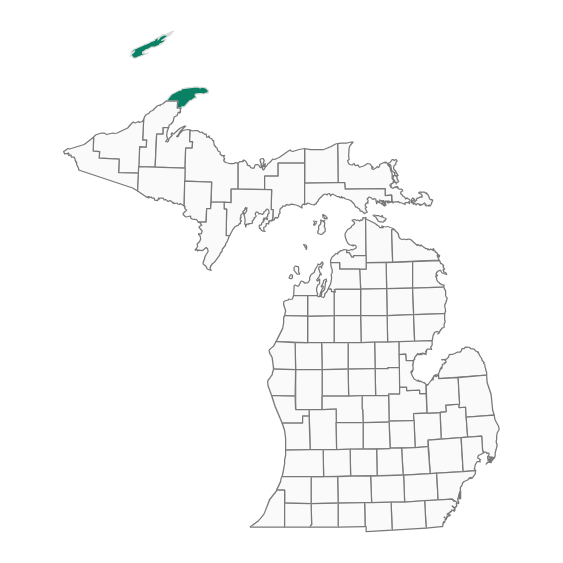 The Keweenaw Peninsula and Isle Royale feature some of Michigan’s oldest and largest rock formations. These volcanic bedrock ecosystems formed over a billion years ago during a time of intense volcanic activity. Lava flowed from deep cracks in the Earth’s crust, creating thick layers of basalt which locally features sandstone and conglomerate intrusions. The subsequent Lake Superior Syncline formation created the basin for most of Lake Superior (Dorr and Eschman 1970, Schaetzl et al. 2009).