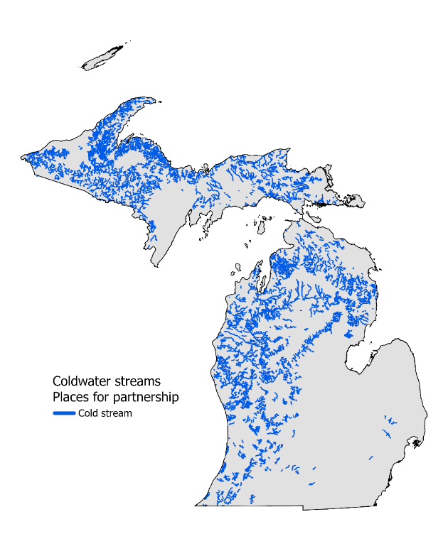 In this plan, Coldwater streams are defined as having average July water temperatures less than 67 F. Coldwater streams represent roughly 28% of the streams miles in the state and are, therefore, a relatively rare habitat type. Coldwater streams are dependent on groundwater inputs which arise from watersheds with coarse-textured glacial deposits of sand and gravel. Groundwater inputs are not only important for maintaining cold summer stream temperatures, but they also produce relatively stable stream flows. Coldwater streams are found primarily in the northern portion of Michigan’s Lower Peninsula and across the Upper Peninsula.